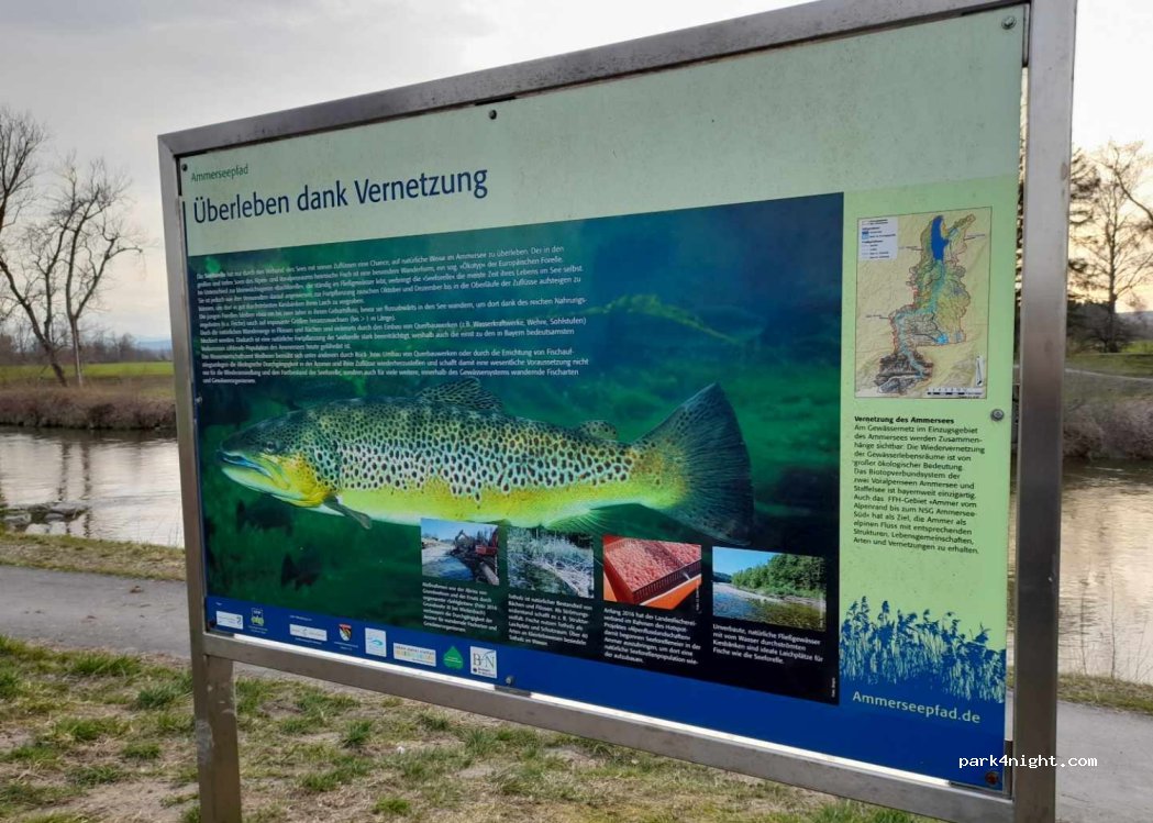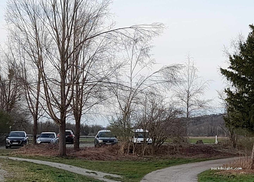 Ausreichend großer und geschotterter Parkplatz eigentlich sogar 2 Plätze da ein asphaltiertet Weg durch den Parkplatz führt. Sehr nah an der Ammer etwa 10 Meter bis zum Fluss. Sehr schöne Landschaft und hatte das Glück die Alpen in der Ferne zu sehen. Nachteilig ist, das der Parkplatz sehr dicht an einer Straße liegt, die in Stoßzeiten sehr belebt ist, jetzt gegen 18:00 Uhr doch so einiges los.