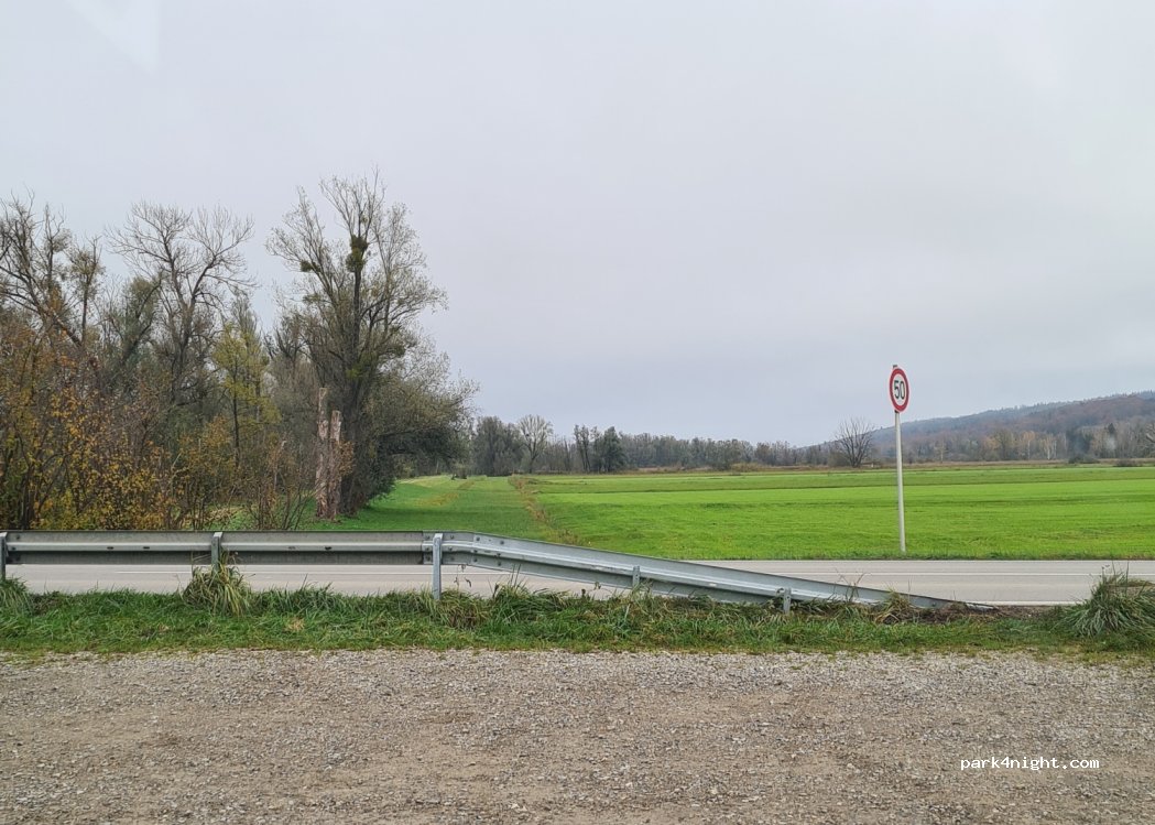 Nachts ok, ab früh morgens aber sehr viel Verkehr auf der Straße. Ziemlich ebener Schotterparkplatz in schöner Umgebung.