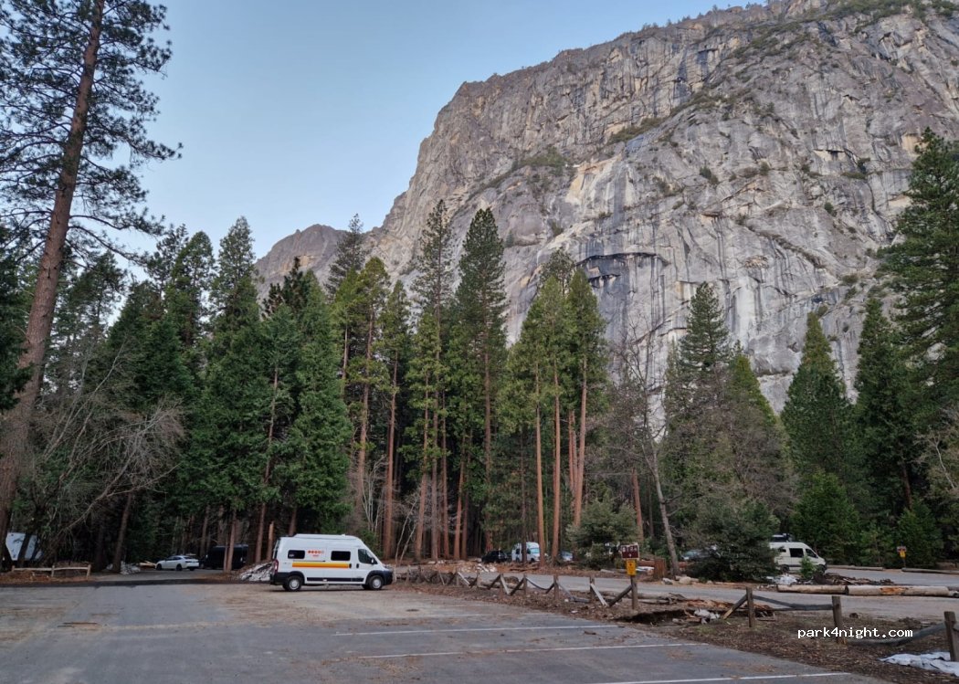 There is a large parking lot. This one has plenty of room for larger RVs a little further away. It is free. Next door is a great Yosemite lodge, with a restaurant and gift shop, and across the street at the campground are bathrooms. The view is fabulous and you can hike and climb from here.