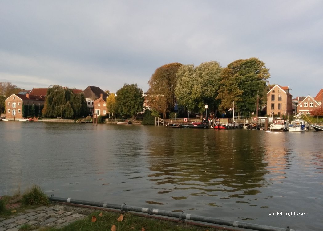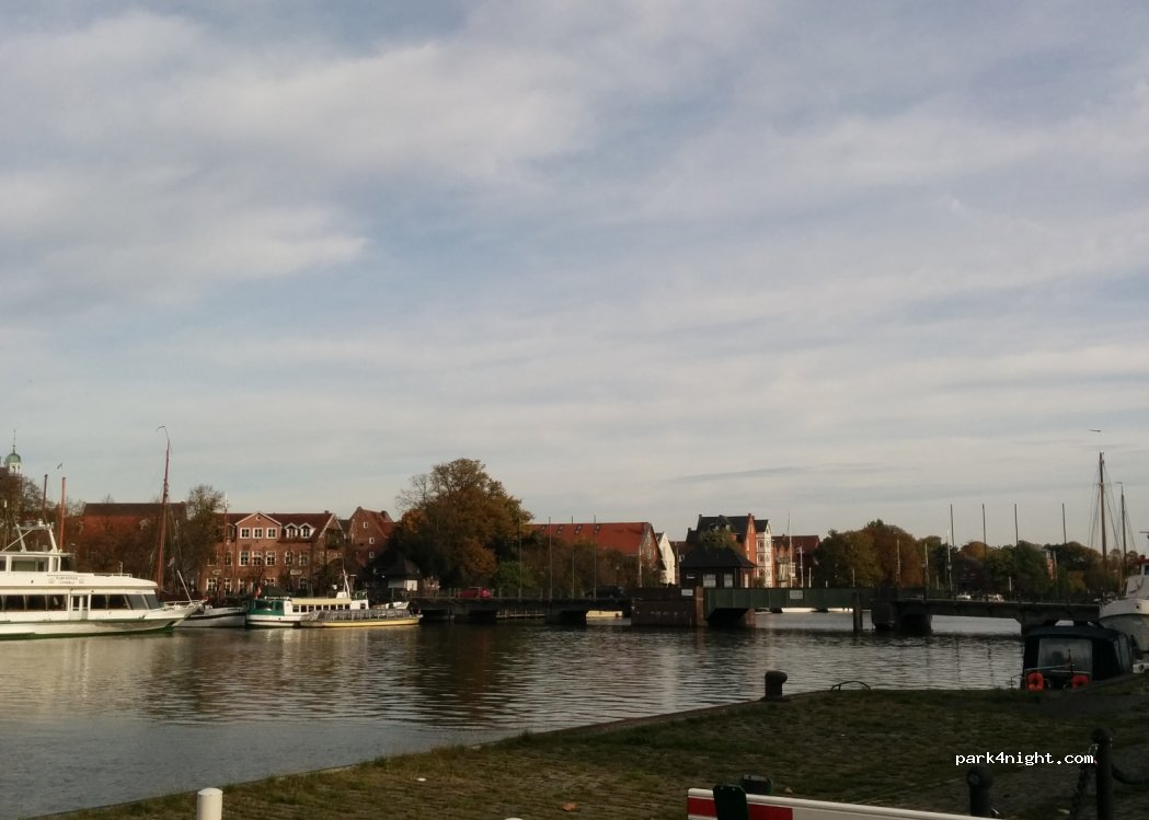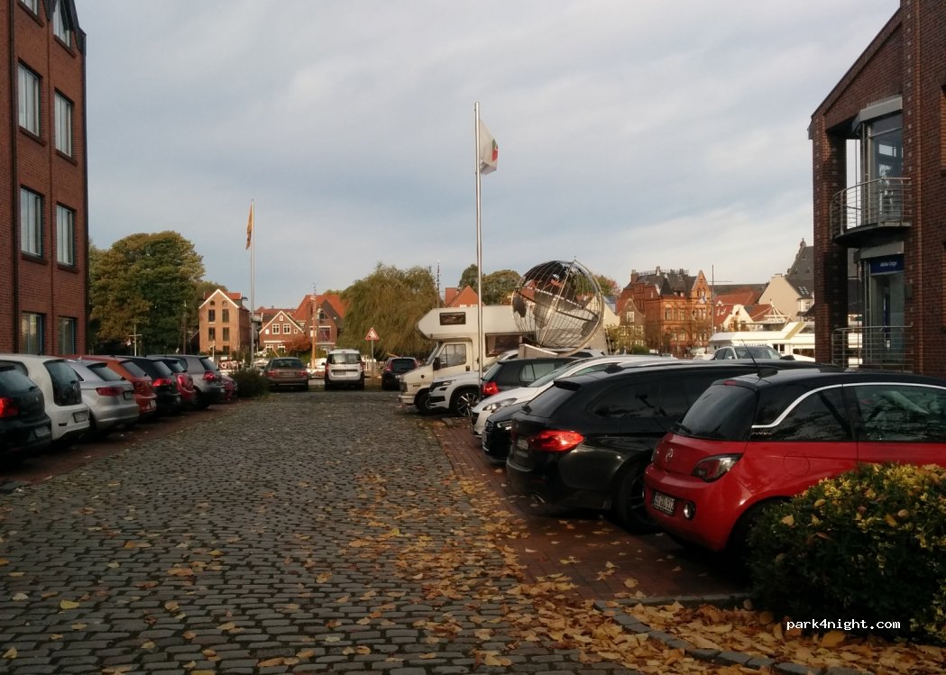 Schöner Blick, aber für längere WoMos (auch schon für MB Vito langer Radstand) ungut, da sonst die Fahrbahn für andere zu eng wird - und weiter vor kann man nicht fahren, weil dort nur ein sehr niedriger Bordstein mit sehr geringem Freiraum/Gehweg zum Ankern der Boote bis das HafenWasser ansteht.