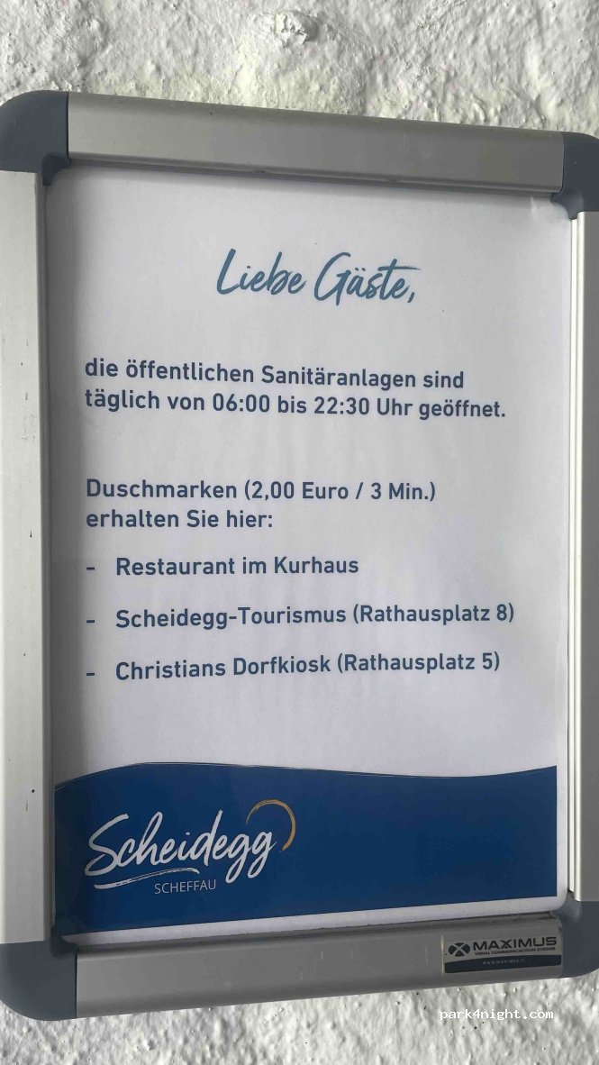 The overnight price includes the parking space fee, electricity costs and the spa fee. You can get shower tokens at the Kurhaus, at the tourist office or at Christian's village kiosk.