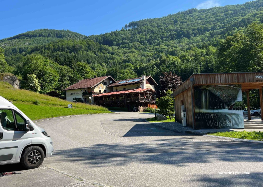 Nach einem köstlichen Abendessen beim Forellenhof, haben wir eine sehr ruhige Nacht am Parkplatz vor dem Kiosk der Ysperklamm verbracht. Der sehr freundliche Wirt hat uns sogar E-Strom angeboten. Da wir autark unterwegs sind, haben wir dankend das Angebot nicht angenommen. Die Ysperklamm ist sehr sehenswert. - Über die Ausstattung des Parkplatzes wurde bereits berichtet.