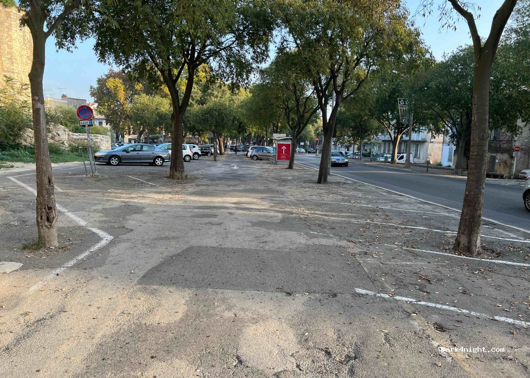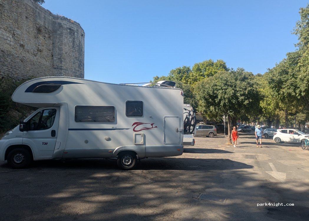 parking de ville. accès compliqué avec un cc de 6,70m. il y a un endroit où on peut se garer avec un cc, c'est contre les remparts, mais que s'il y a de la place. sur les autres emplacements, obligation de prendre deux places pour se garer. après quand on trouve de la place, on est pas loin des arènes, c'est le seul bon point.