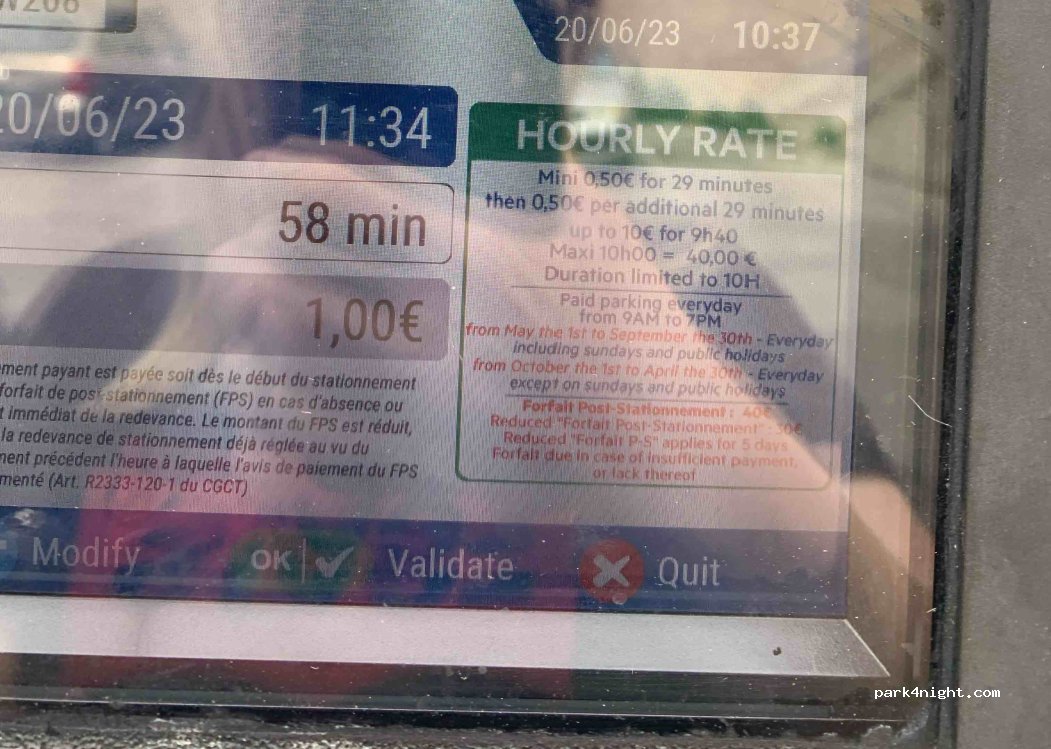 A pagamento 9-19 (1€all'ora) ATTENZIONE mercoledi e sabato da mezzanotte alle 15 vietato parcheggiare causa mercato. Praticamente in centro, comodo per visitare la città. No limite d'altezza e spazioso. Non abbiamo dormito qui, rumoroso perché lungo la strada.