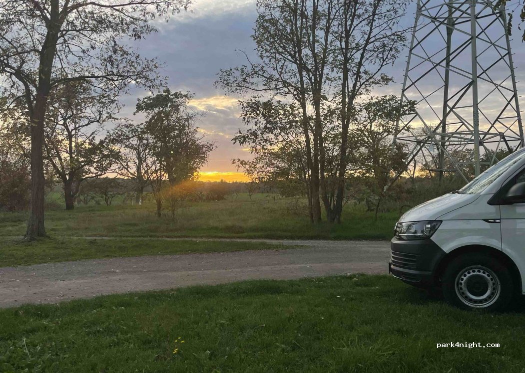 Parking on a street with little traffic. Few cars from hikers/walkers during the day. Hardly any cars at night. Evening view of sunset over fields. Table and benches, as well as a rubbish bin available. The wood mill pond and viewpoint on the quarry can be reached on foot in a short time. No sign prohibiting you from driving directly to the wood mill pond on the shore.
