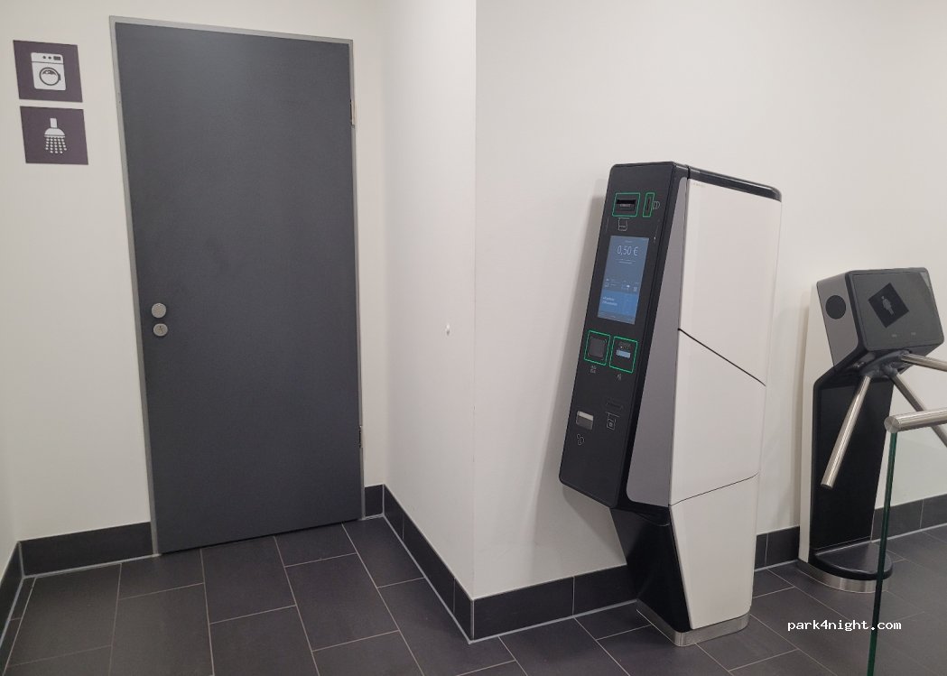 Für 3€ und als Pfand den Autoschlüssel od. ein Dokument, bekommt man an der Kasse den Schlüssel zu einer der Duschen. Die Duschen sind sehr sauber & vorallem zeitlich unbegrenzt. Toilette, Waschbecken und Fön vorhanden. Für 3€ kann man wirklich nichts sagen! Super Spot zum Duschen.