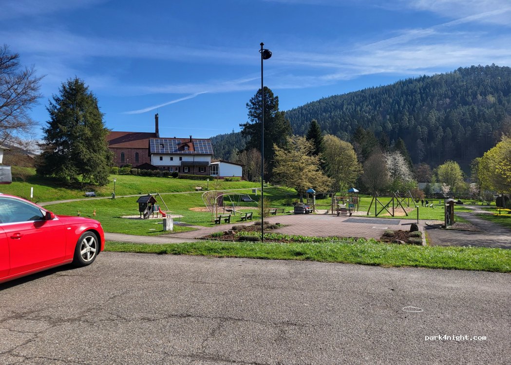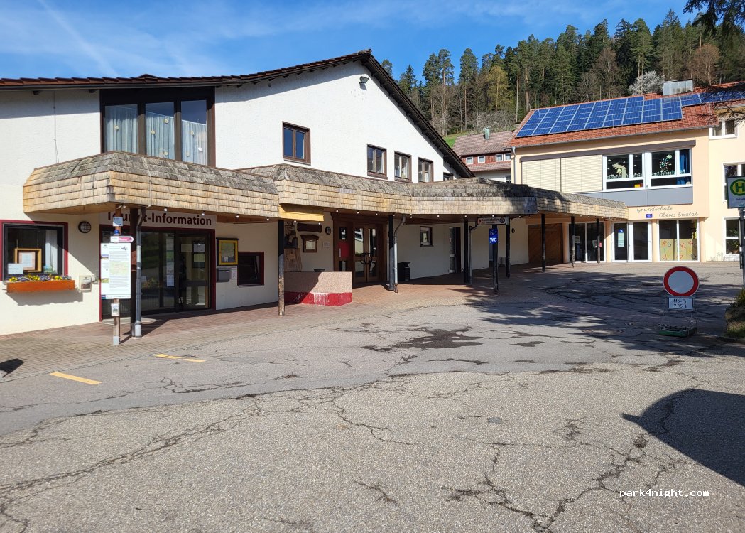Parking in front of the tourist information. Overnight or RV parking is not prohibited. The parking lot is also used in the morning to bring children to school.