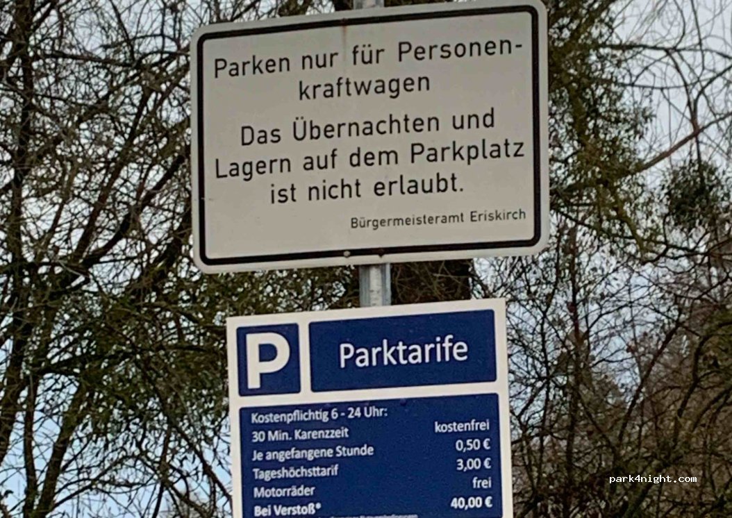 Übernachten verboten. Gebührenpflichtig, die erste halbe Std. gratis, Tageshöchsttarif 3 €.