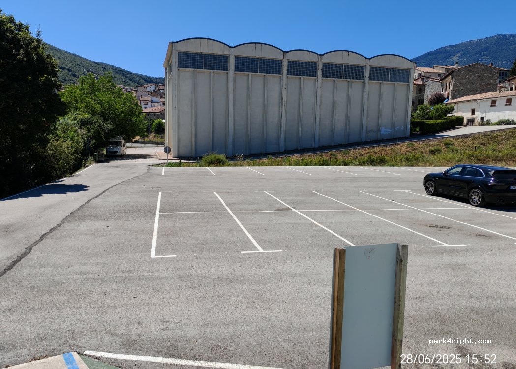 Motorhome parking area next to pumptrack, maximum overnight stay of 5 days, next to the fronton and soccer fields with benches. A tap and gray water area have been installed in the upstairs area, with the usual services of a motorhome area.