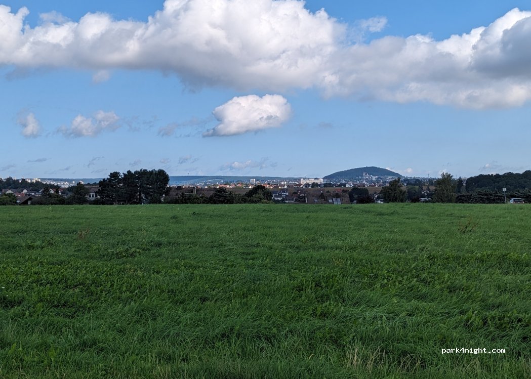 es ist einfach ein Parkplatz. Nicht mehr. Eben. Schotter. Abends war hier noch was los. Einer ließ seine Drohne ewig noch über uns fliegen. Nachts war es dann ruhig, bis um 6.30 die Krähen kamen, hunderte, und einen mords Krach veranstalteten. Herrlicher Sonnenuntergang und auch Sonnenaufgang von hier zu sehen. Schloss und Schlosspark schon. Biergarten nicht zu empfehlen (schmuddelig).