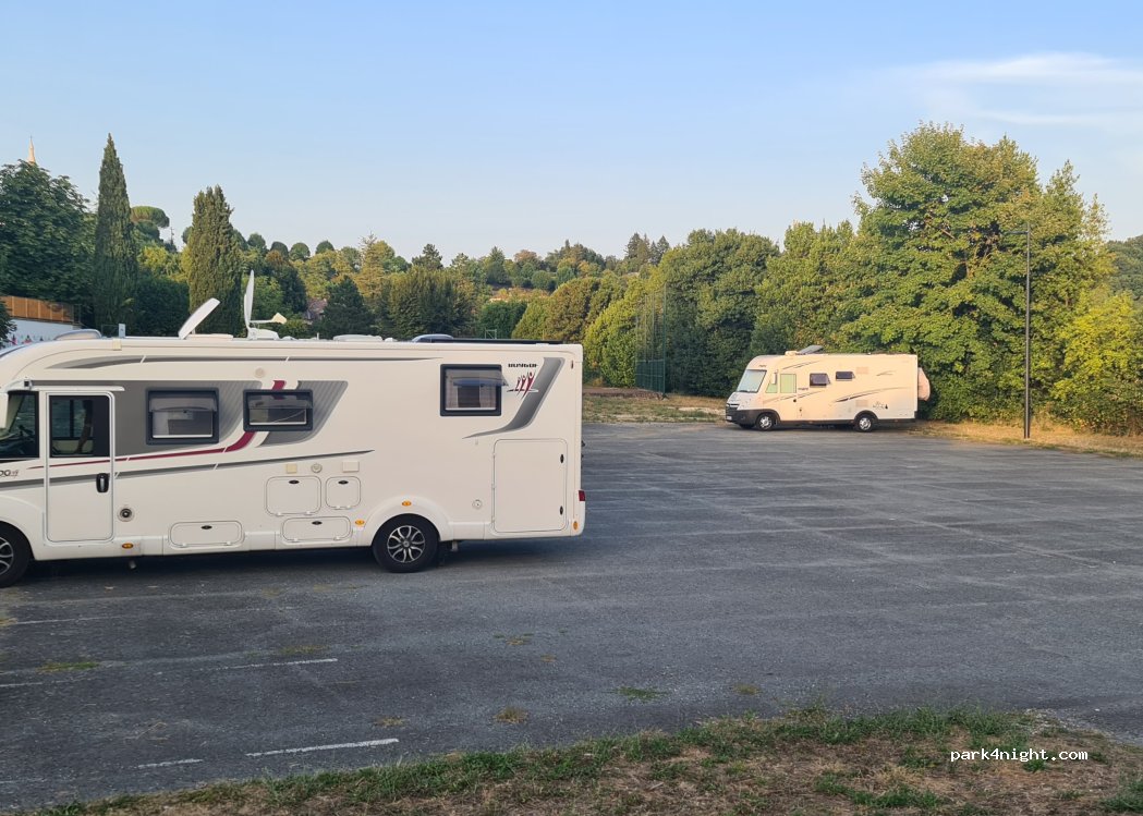 le parking en bas est très vaste, plat et calme. un peu d'ombre. les enfants ont apprécié les jeux et le terrain de sport. attention en période scolaire car c'est juste à côté du collège. le village est très joli. chateau intéressant et spécialité délicieuse (la Cornuelle)