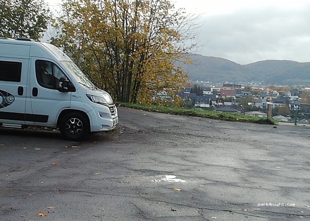 The public car park belongs to the castle. It's free and there aren't any signs prohibiting motorhomes. The driveway is very steep but no problem for vans. Once at the top there is relatively straight parking for 6m camper vans and a brilliant view at the top. Castle, old town and waterfall everything is within walking distance.