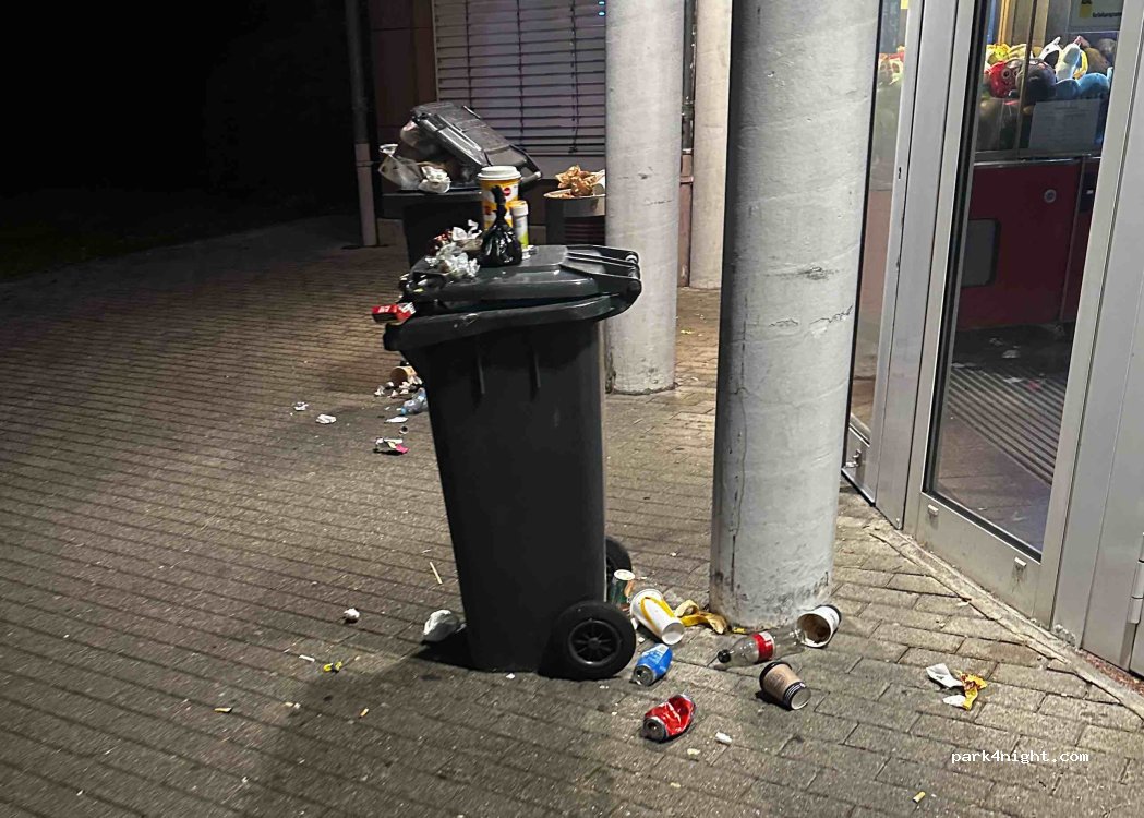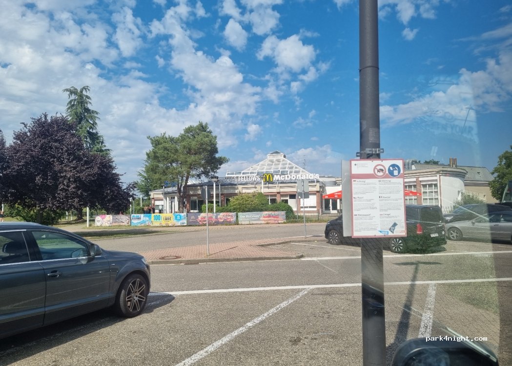Parkplatz völlig zugeparkt durch LKW, auch der WoMo Bereich, selbst hinter einer 2.5m Höhenbegrenzung. Kaum Lücken zu finden (und wenn dann 6m max).