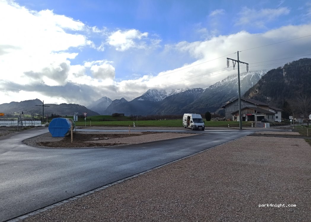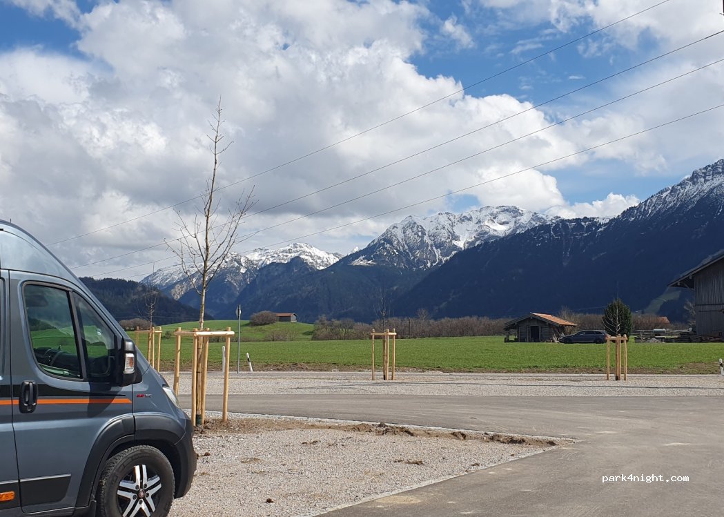 Einfacher Parkplatz mit grandioser Aussicht auf die Berge. Gebührenpflichtiger Wanderparkplatz, Nachtparkverbot für Camper.