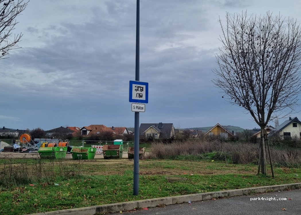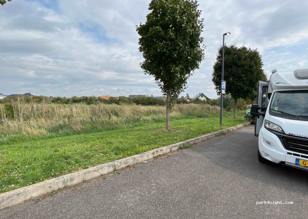 Am Ortsrand neben Sportplatz. In der Nähe Lebensmittel Märkte. Leicht schräg, im Grunde ein öffentlicher Parkplatz aber 5 Plätze für wohnmobile erlaubt.