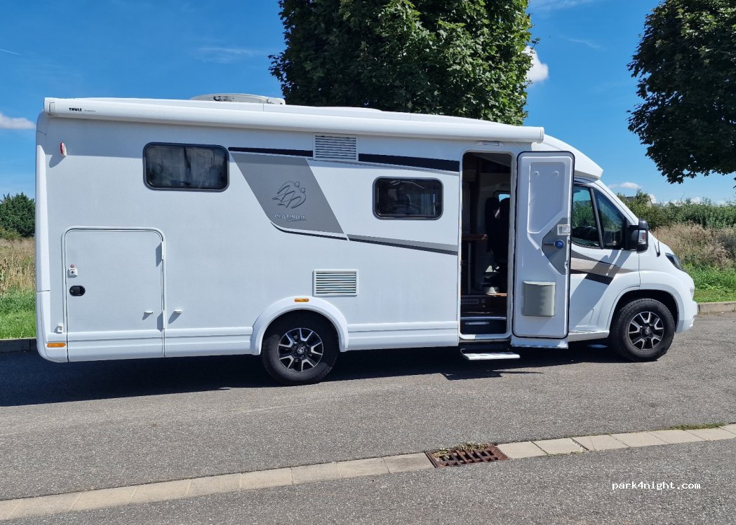 On the outskirts next to the sports field. Nearby food markets. Slightly sloping, basically a public car park but 5 spaces for mobile homes allowed.