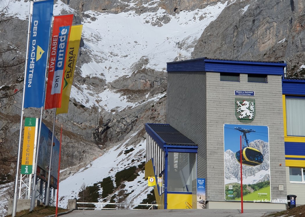 Großer Parkplatz für die Abfahrt der Gondelbahn zum Dachsteingletscher. Sie können die Hängebrücke und die Fußgängerbrücke im Vakuum bauen. Die Straße ist kostenpflichtig, aber Sie können das Ticket an der Spitze der Gondel entwerten und es kostenlos zurücknehmen. Zelten verboten.