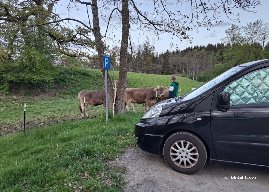 Der Parkplatz ist sehr idyllisch, mit Kühen hinter dem Auto. Wenn man aber das Pech hat, weil irgendwelche Technofreaks voll aufdrehen im Wald dahinter, ist es vorbei mit Idylle und zwar bis morgens!!!