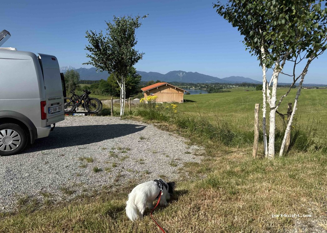 Sehr schöner Platz, vor allem wenn man autark stehen kann. Am See steht sonst ein Dixi, zu welchem wir mit unseren Fahrrädern fuhren, da wir keine Toilette im Van haben (ca. 5 Min.) In der Umgebung kann man gut Radfahren (teilweise Schotter, mit dem Rennrad haben wir manchmal gekämpft) und dabei auch andere Seen besuchen (Kochelsee, Staffelsee, …). Die Straße stört nicht, nachts kaum befahren :)