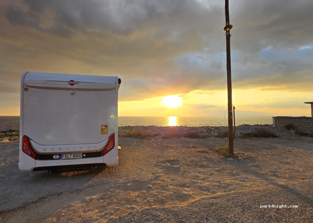 Wir haben hinten neben der Bauruine eine ruhige Nacht verbracht. Der Parkverkehr im vorderen Teil bis Mitternacht hat uns nicht gestört. Nur das erste Foto zeigt diesen Platz, die anderen zeigen den großen von Osten anfahrbaren Parkplatz direkt östlich vom Hafen an der Küste, der stark von den Restaurantbesuchern und Baumaterial belegt ist und in Park4Night nicht erfasst werden darf.
