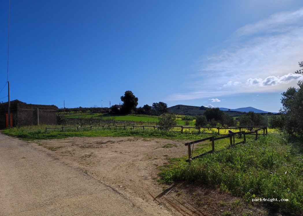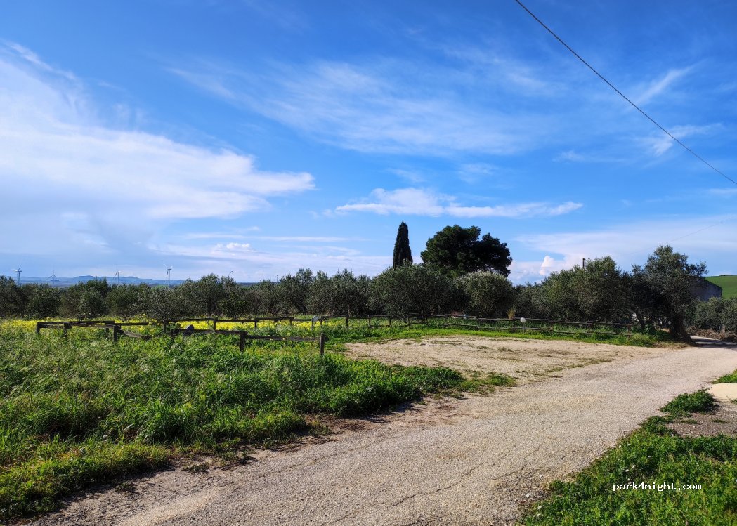 Il s'agit du parking d'un restaurant adapté aux camping-cars, situé sur une colline au milieu des oliviers et des vignes, à 1,5 km de la route nationale SS113 et à 5 km de la sortie de l'autoroute A29dir.