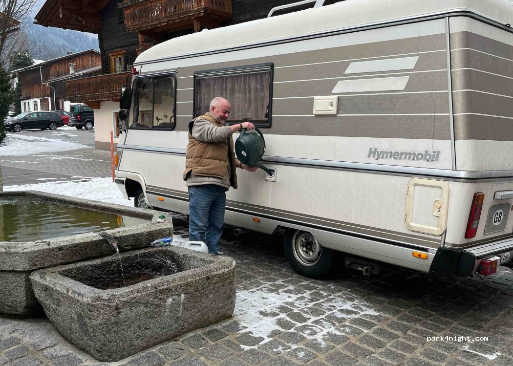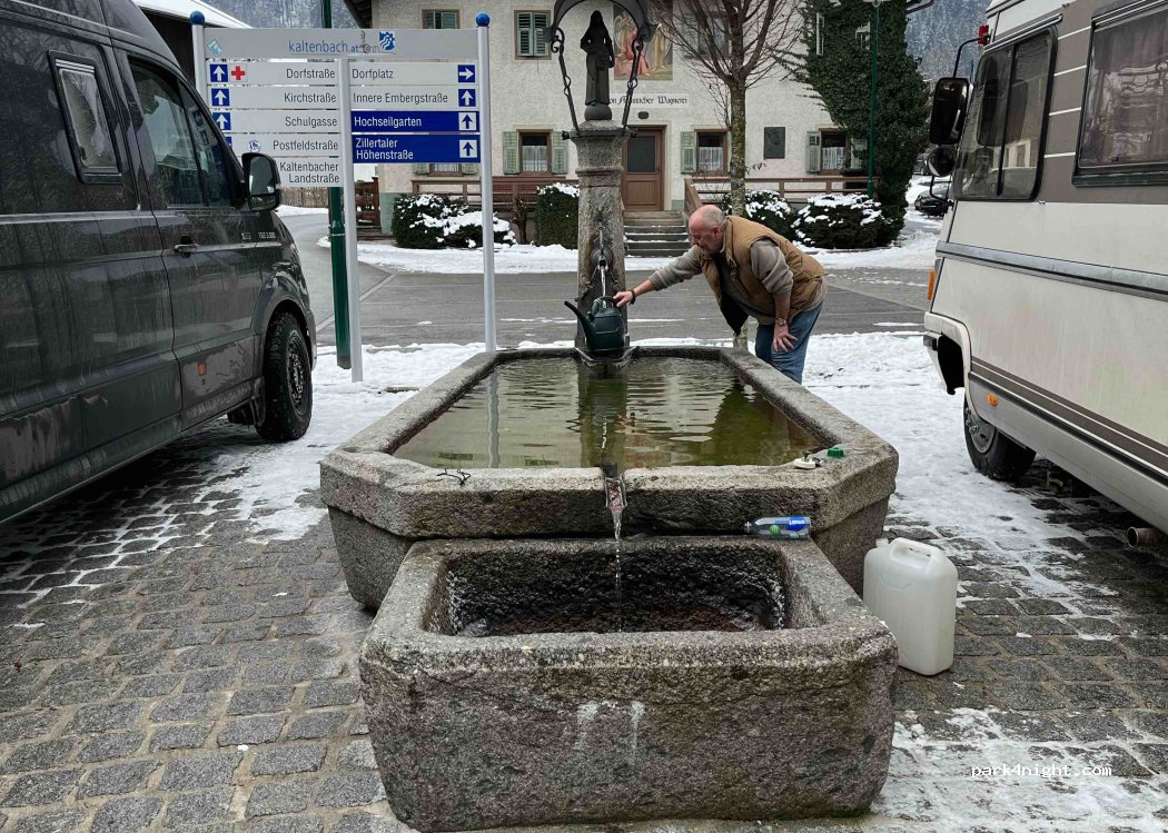 Kostenloses trinkbares Bergwasser können Sie neben dem Brunnen parken und Ihr Wohnmobil füllen