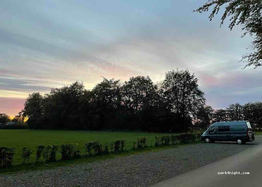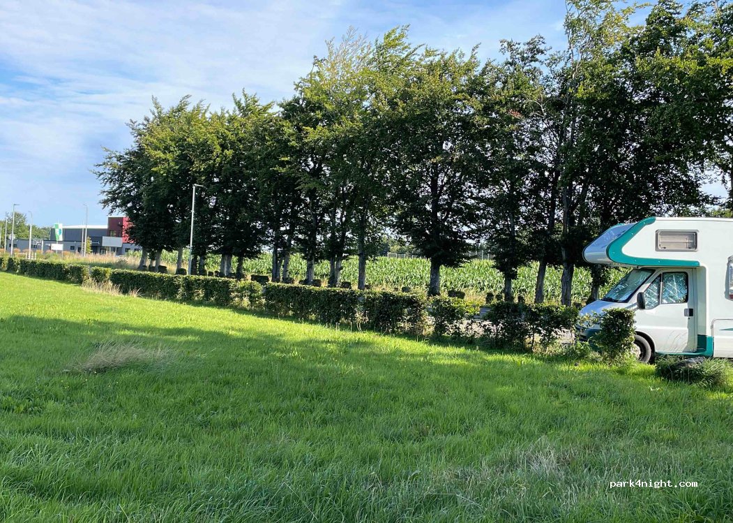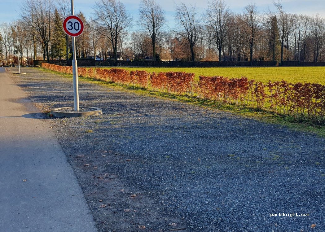 Rustige plek tegenover sporthal met clubhuis aan doodlopende weg. P-plaats is mooi recht met kiezelsteentjes.