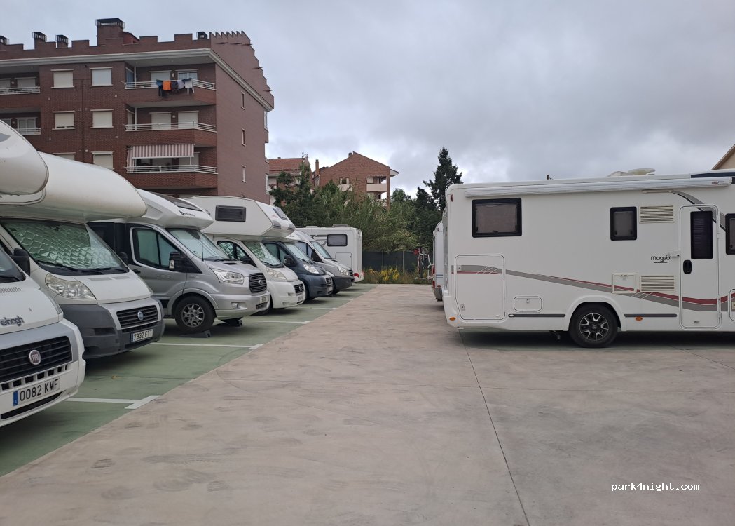 Great parking with services in good working condition. A 10 minute walk into the old town which has some lovely tapas and wine bars. There was three other campervans here when we were here, if it was full, I think it would be hard to manoeuvre in a larger vehicle but absolutely fine when it's not full. Flat with marked out parking spots.