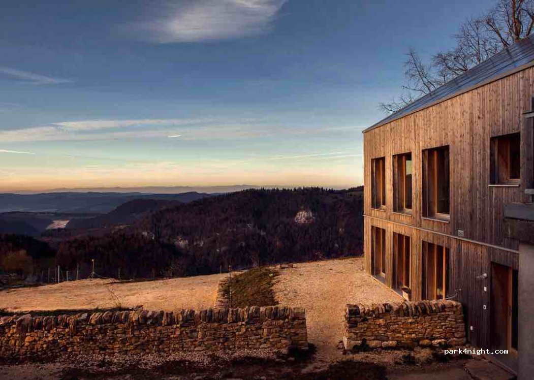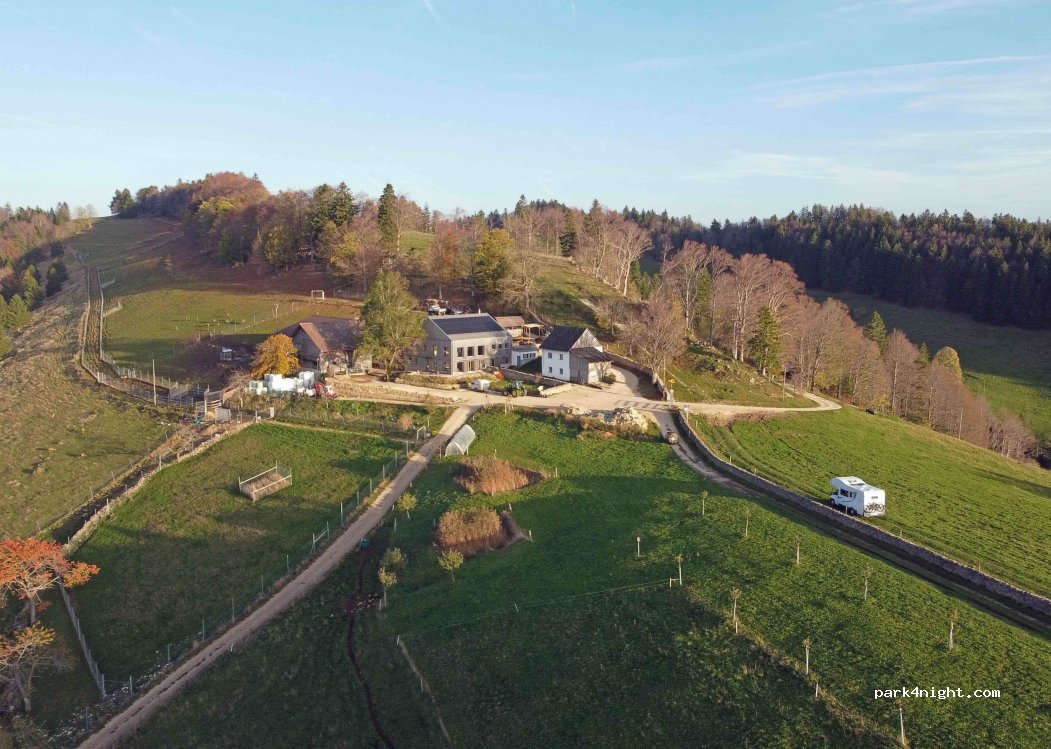 (pré-inscription auprès de l'agriculteur obligatoire). La ferme est située sur la deuxième chaîne du Jura avec un panorama à couper le souffle jusqu'aux Alpes. Diverses randonnées ou circuits à vélo avec de superbes vues et divers endroits pour s'arrêter peuvent être entrepris à partir de la ferme. Accès à la montagne légèrement étroit et escarpé - recommandé pour les campeurs jusqu'à un maximum de 7 mètres. En hiver avec de la neige uniquement avec 4x4.