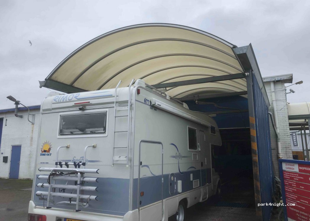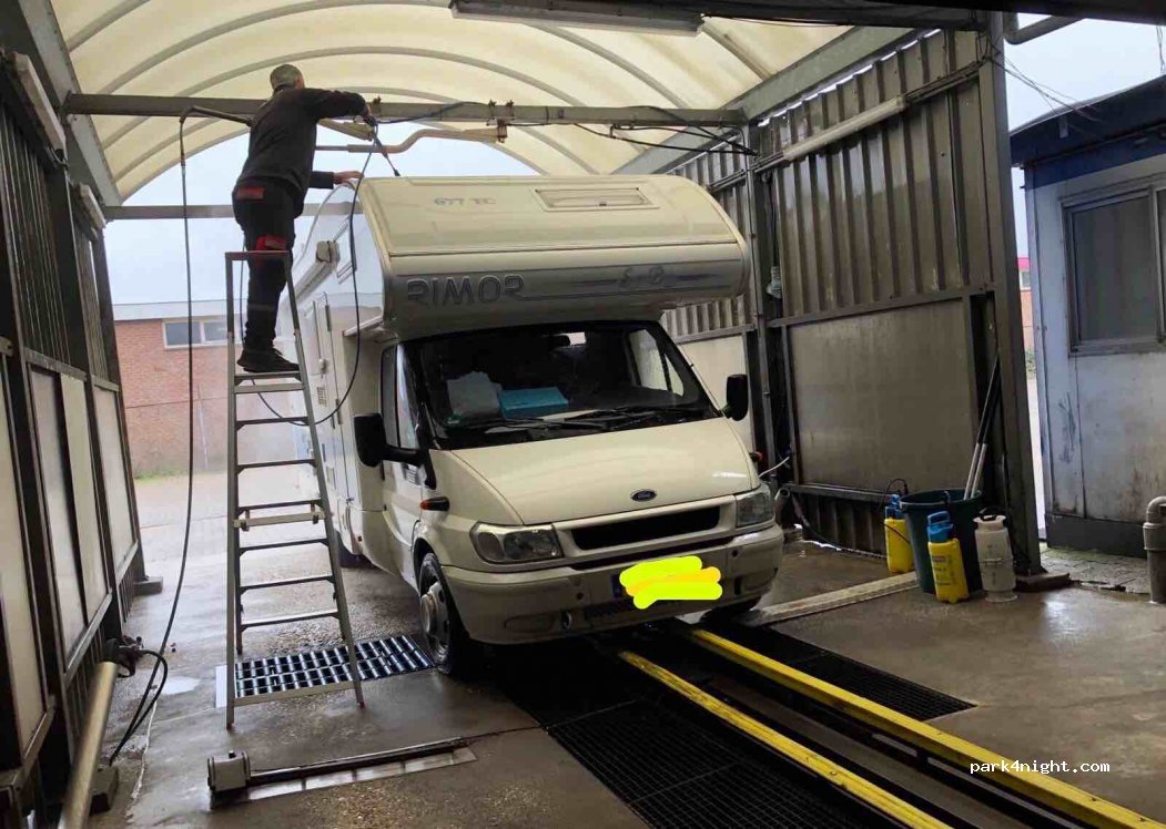 Just behind the Tinq gas station is a car wash for campers. He washes the entire camper by hand (soap and high-pressure spray). Picobello clean! He also washes the roof. Make sure you put something under it at the ventilation holes. Wash and polish available as well.