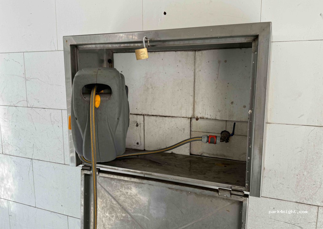 Go inside, pay your 4.5 Euro then they come and unlock the water connection point and also open the black waste. Have added additional photos of the services.