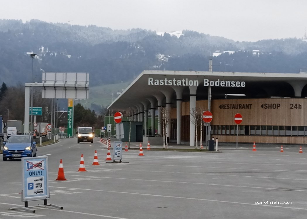 Kostenlose Parkplätze sind in ausreichender Zahl vorhanden. Ladestationen für Elektrofahrzeuge sind vorhanden. Das Restaurant ist rund um die Uhr geöffnet, ebenso die Toiletten und weitere Einrichtungen. Eine Vignette ist an der Kasse oder am Automaten erhältlich. Ein idealer Zwischenstopp auf Reisen. Der Blick auf die Berge ist großartig, aber der Parkplatz liegt in der Nähe der Autobahn, daher ist mit Verkehrslärm zu rechnen. Keine Übernachtungen.