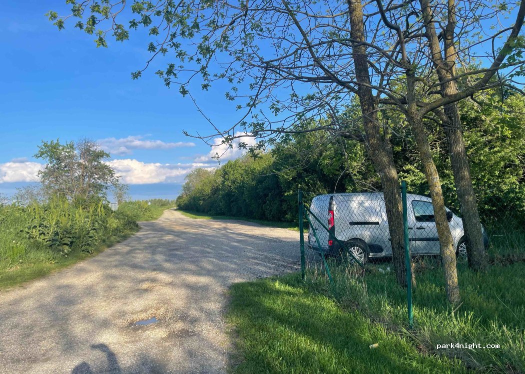Shaded parking next to a large fenced dog area. Perfect spot for one or two nights. water tap provides freshwater from april to october. Factory behind can be noisy from Monday do Friday. Beautiful lake with sandy beach and kids playground nearby. Please take your trash with you and leave some parking space for the visitors of the dog area in order to keep this space accepted by the community. Thanks!