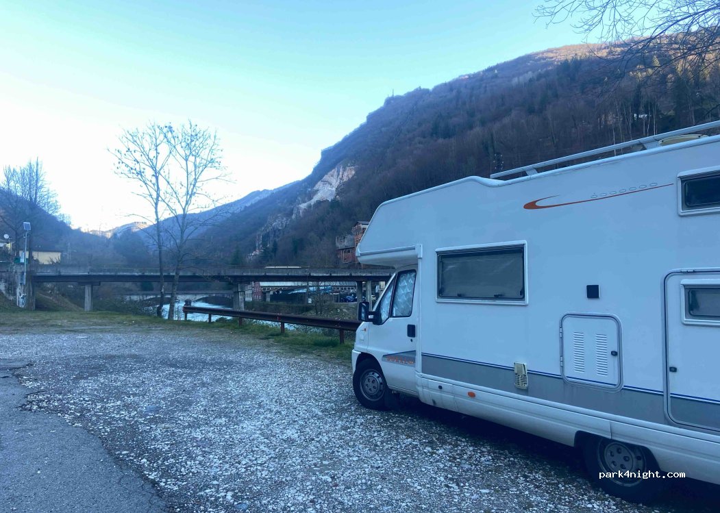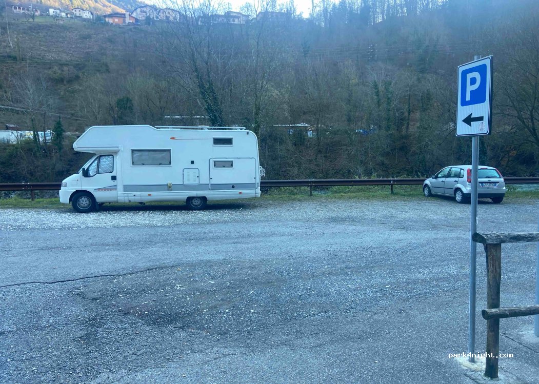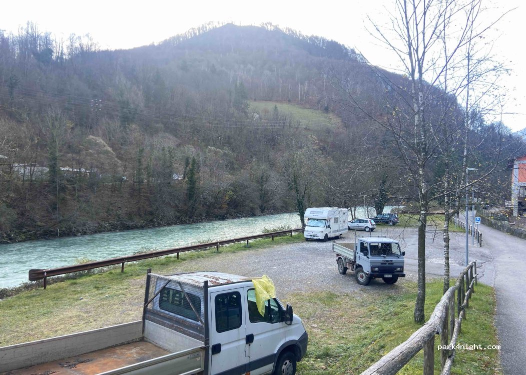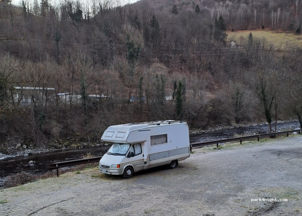 Ampio parcheggio sterrato di fianco al fiume (il rumore dell’acqua che scorre è molto presente ma a noi non dava fastidio). Non è presente alcun divieto di pernottamento, quindi noi ci siamo fermati una notte.