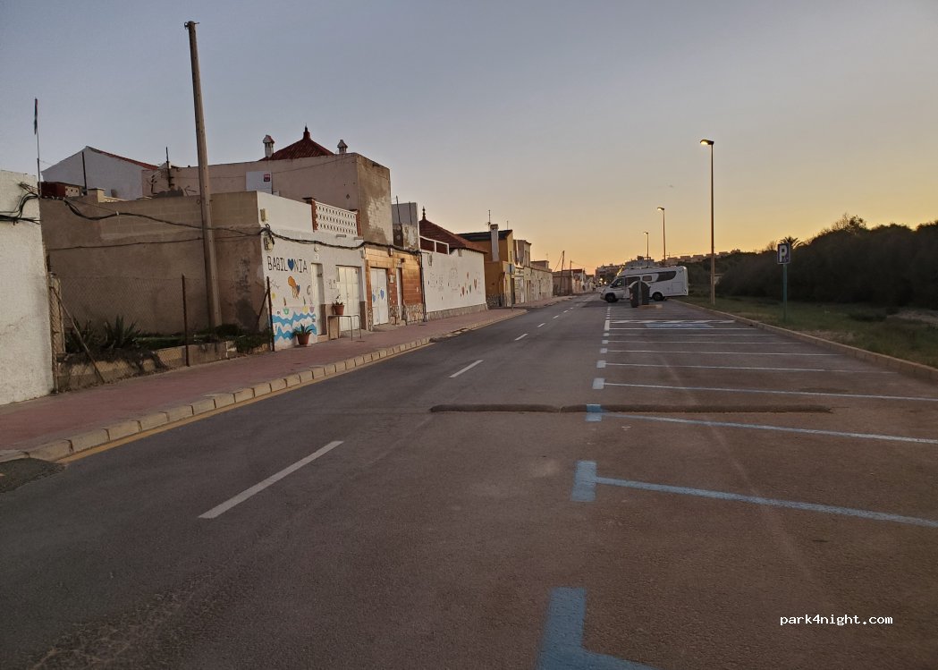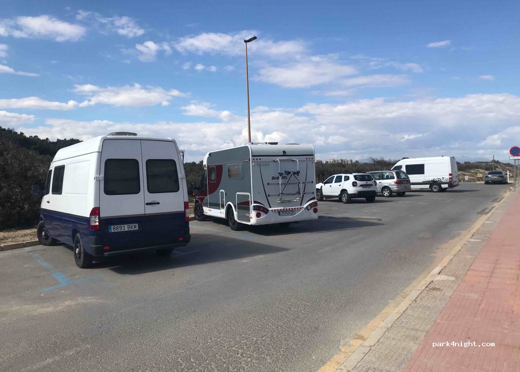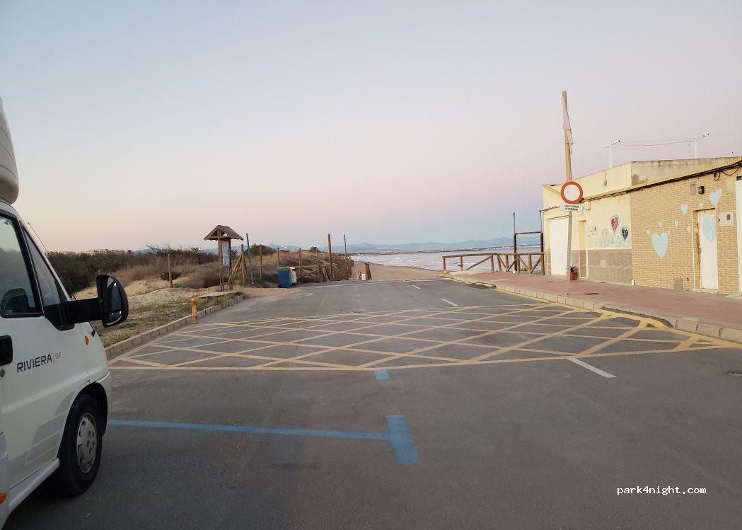 Hier steht man ohne Meerblick hinter einer Häuserreihe. Blaue Linien (also eigentlich gebührenpflichtig).Die Zugänge zu den kleinen Stränden sind abgesperrt mit hässlichen Drahtzäunen (durch schlimme Stürme immer noch akute Einsturzgefahr).Es gibt Baulärm von Häusern, die restauriert werden.Schade, dass es in Guardamar keinen offiziellen Stellplatz gibt: der Ort mit seinen Parks hätte es verdient.