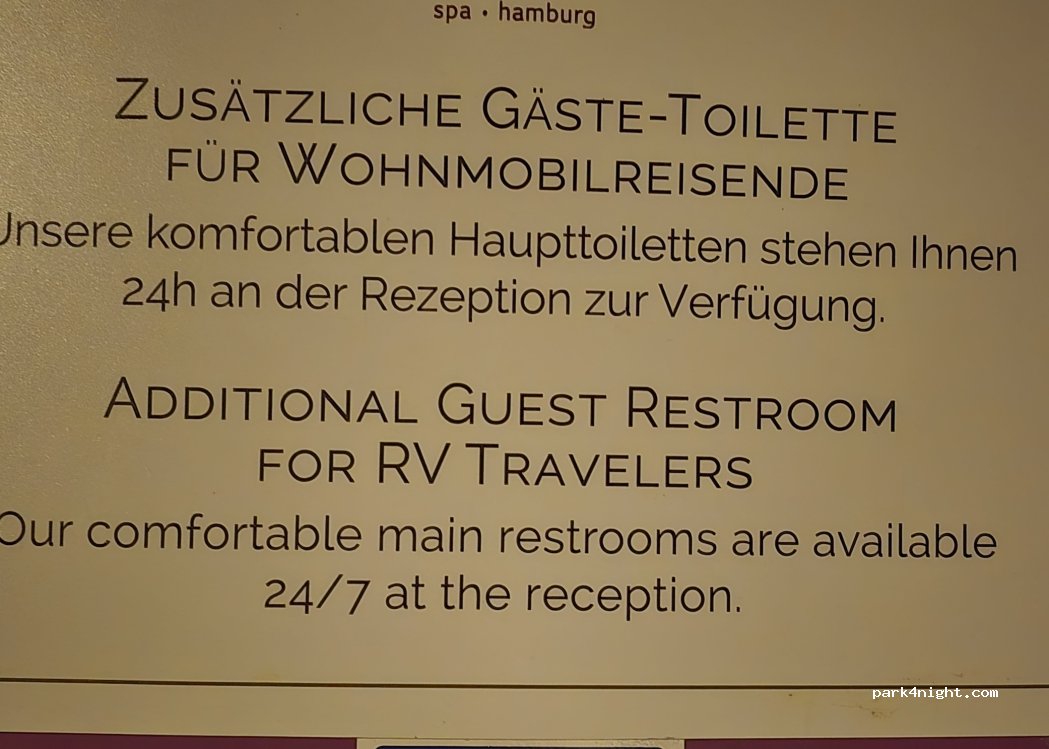Le parking appartient au spa Vabali de Hambourg. C'est un parking goudronné où le stationnement coûte 2,50 € (pour les clients du spa). Idéal pour une journée de bien-être au Vabali, il permet également de passer la nuit. Très calme la nuit, vous ne serez pas dérangé. Les camping-cars de grande taille peuvent y stationner. Six emplacements avec branchement électrique gratuit (16 A) sont disponibles.