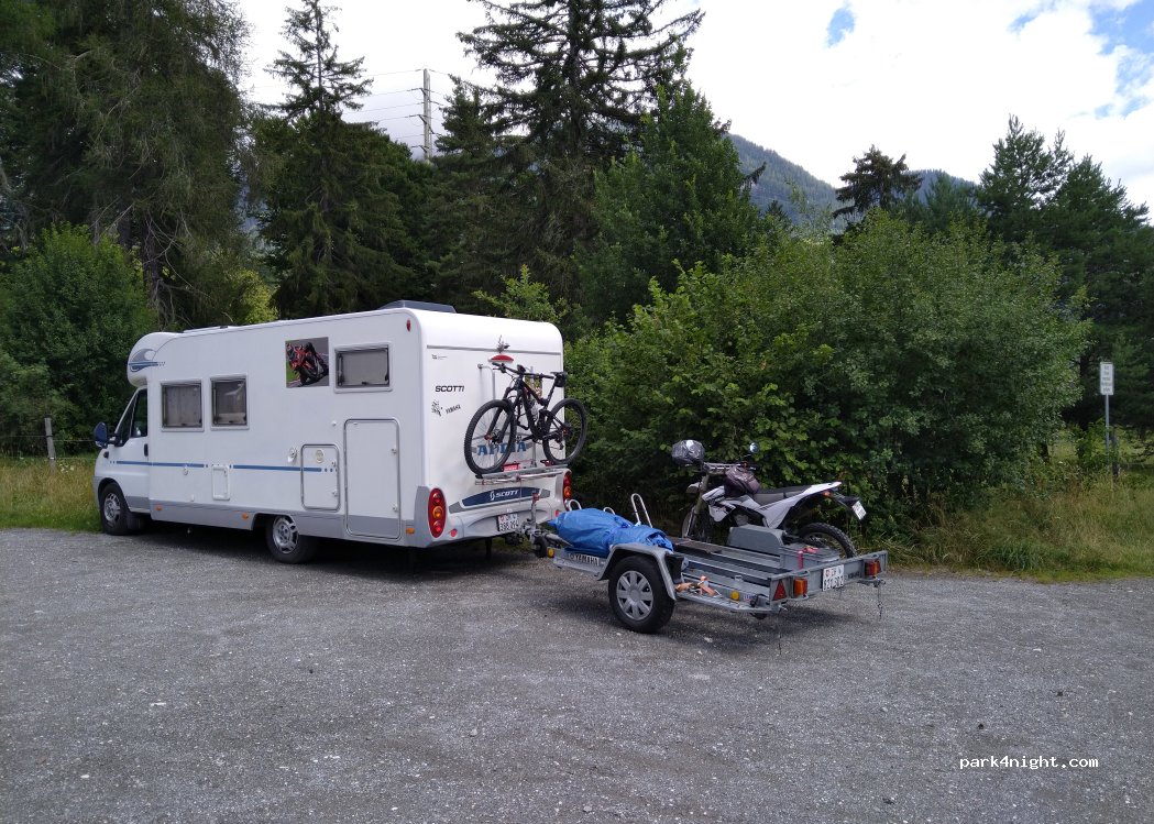 Rare parking gratuit en Suisse et autorisé pour la nuit en CC avec accès facile. En dessous d'une ligne HT et un peu de passage routier certes, mais au moins on ne paie pas un emplacement pour dormir.