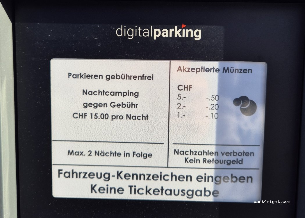 Nicht mehr kostenlos CHF 15.-/24h über Standard App oder am Automat zu bezahlen. Niemals Parkschild aufgestellt aber auf Parkuhr steht zum Übernachten im Camper