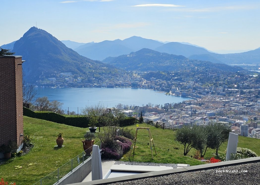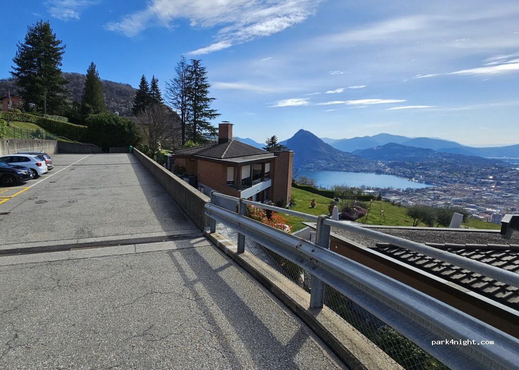 Parcheggio in piano, vista su Lugano e ristorante nelle vicinanze