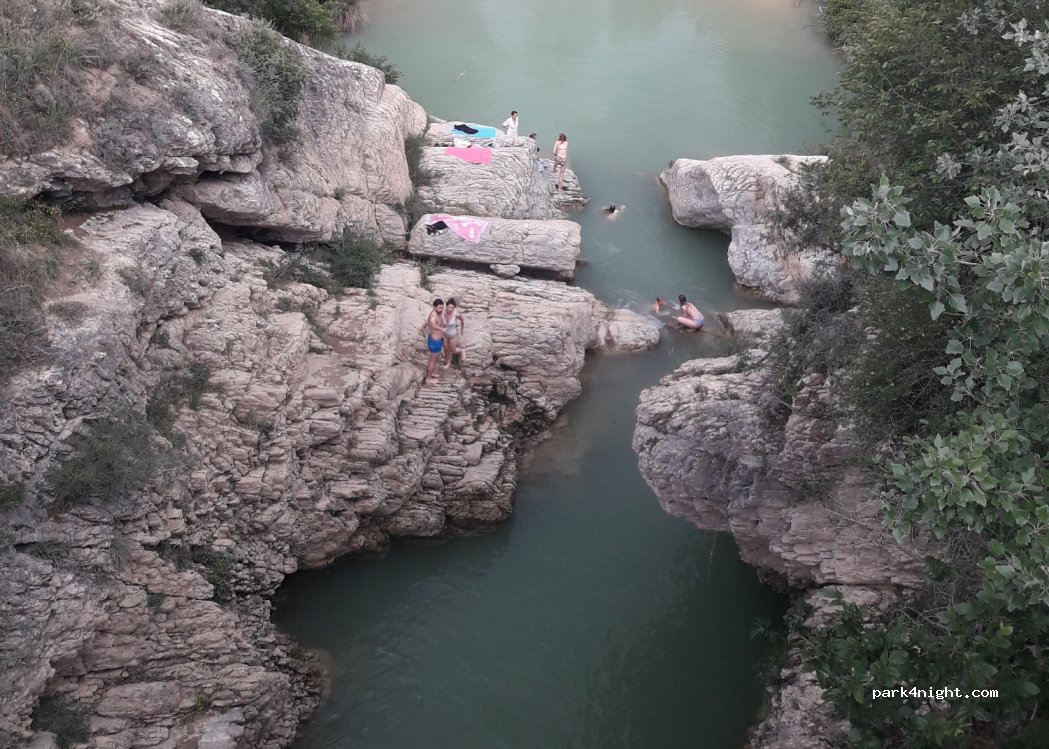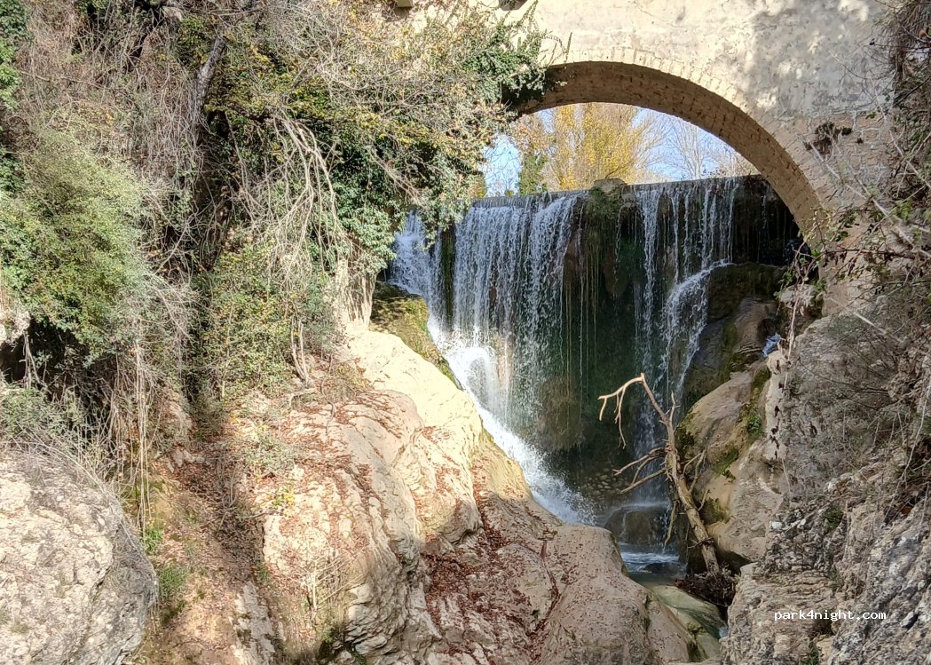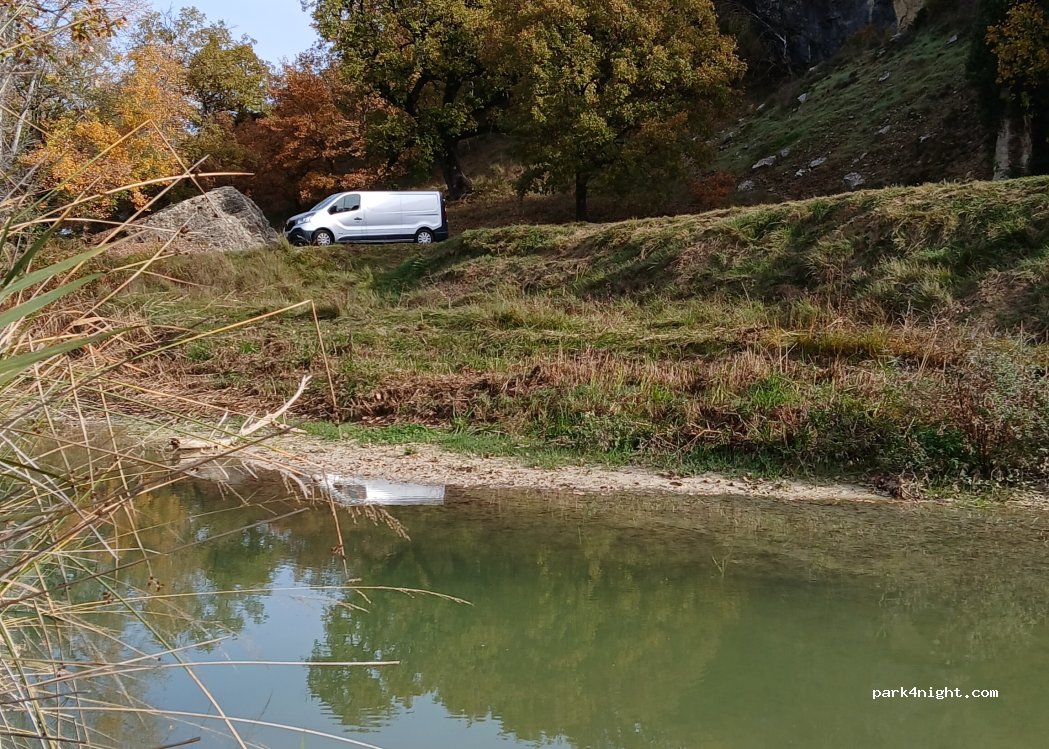 Am Rand einer wenig befahrenen Straße. Zugang zum Fluss und schöne Aussicht auf den Mini-Wasserfall. Ideal für eine Nacht für alle Fahrzeugtypen