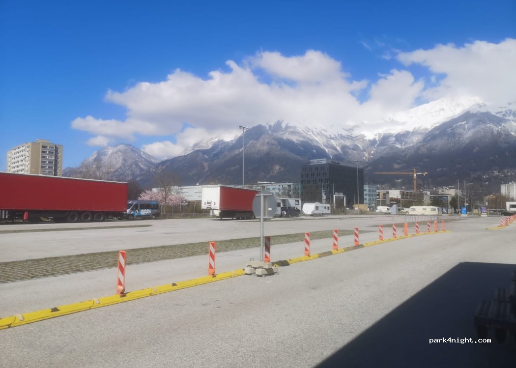 Can be found on Google Maps under "Parking space Innsbruck". Spent one night here with no problems. No service! Center is within walking distance. There are public toilets at the skate park across the street (opening times unknown!)