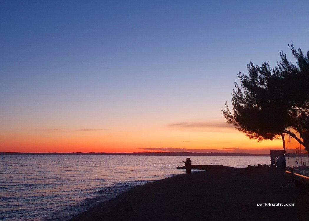 Super emplacement pour ce camping récent en bord de mer. Personnel professionnelle et serviable. Sanitaires nickels. Boulanger, maraîcher, etc.. Passent tous les jours et les prix sont très raisonnables. Heureusement car pas de magasins avant 10 ou 15 km. Sommes restés plus longtemps que prévu, en avons fait notre camp de base pour visiter Zadar, Krka et Split. 43 euros van 2 adultes et 2 enfants