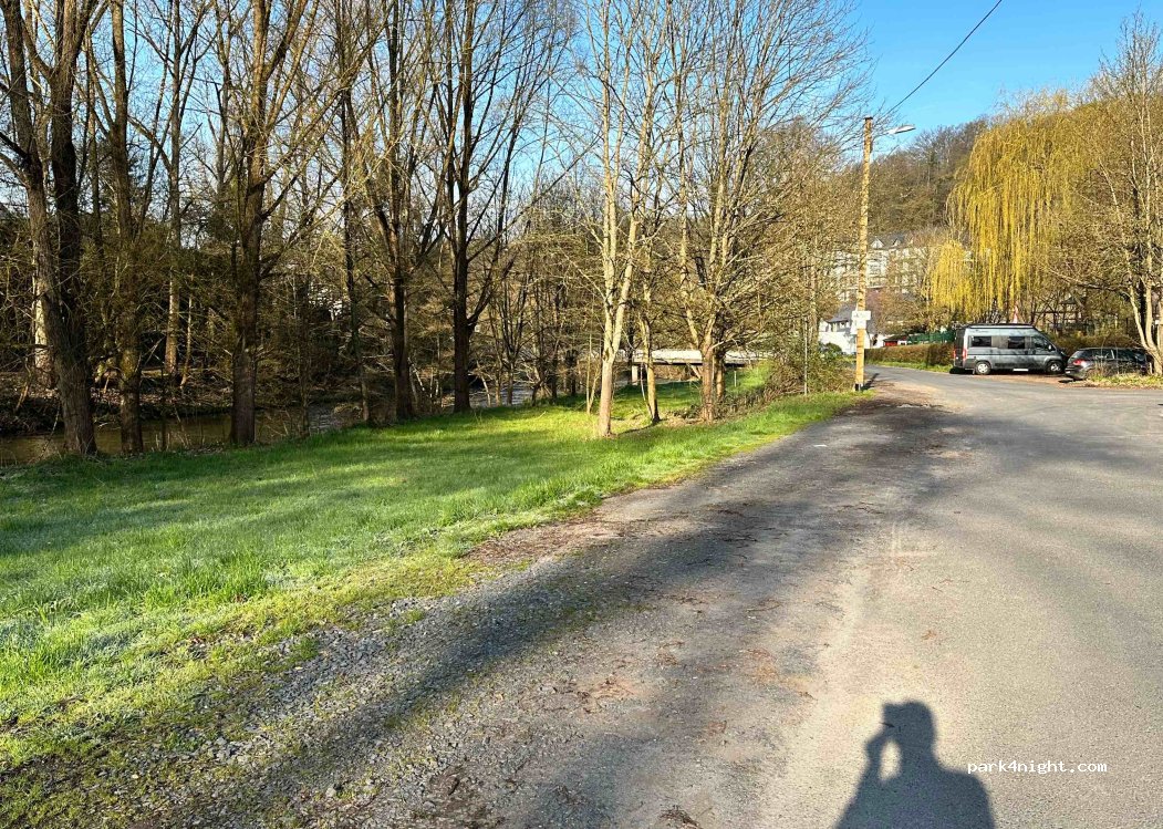 Espace de stationnement situé sur une rue latérale au bord de la rivière. Calme en journée peu de circulation d'accès à la quincaillerie et au jardin d'enfants. Place a une infrastructure et est un bon point de départ pour la randonnée et le cyclisme ... bien adapté pour 1-2 jours.