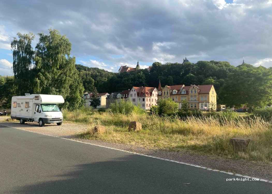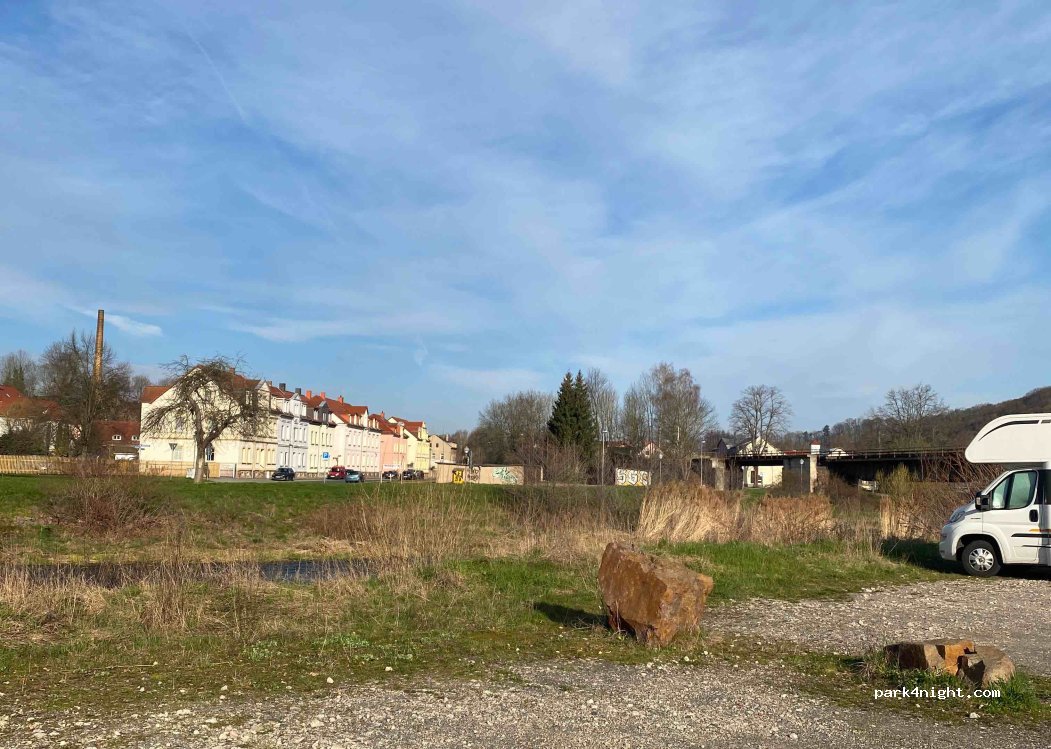 Perfekter Parkplatz am Fluss mit Aussicht auf Schloß und Stadt. Gegenüber eines Autohauses, nachts daher relativ hell durch Straßenlaternen aber trotzdem sehr ruhig!