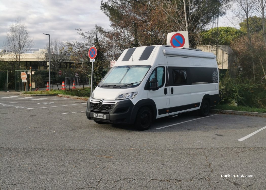 Pratique pour une nuitée étape… à l’entrée de la gendarmerie… rassurant… assez bruyant car à côté de l’autoroute, stationnement 12h max. Places « voitures » donc attention à votre longueur.