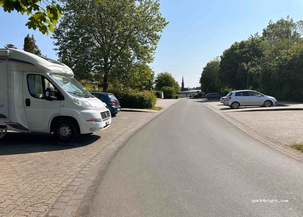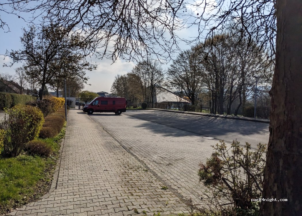 Large car park at the Rheinböllen leisure pool, about two kilometers from the A61. No height limit, well suited for campers up to 6m.