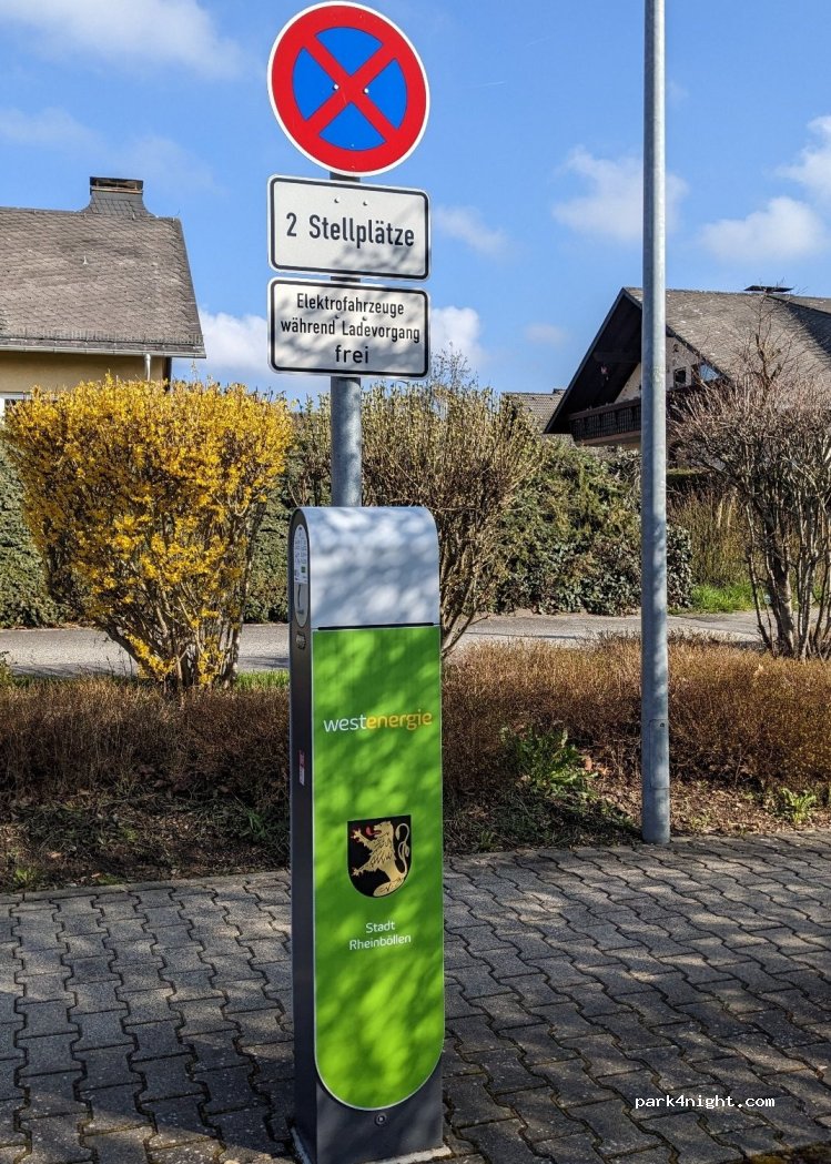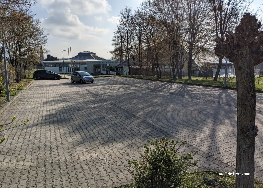Grand parking à la piscine de loisirs Rheinböllen, à environ deux kilomètres de l'A61. Pas de limite de hauteur, bien adapté aux campeurs jusqu'à 6m.