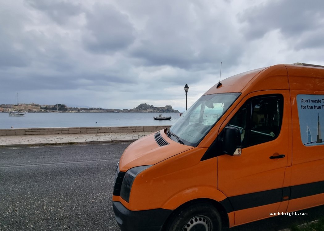 Parking gratuit sur le côté gauche de la route. Un ami local de Corfou nous a suggéré ce parking utilisé par les locaux. Ici, garez également les bus, les camionnettes et les voitures locales. Superbe vue sur la baie de Corfou, 30min à pied pour rejoindre le centre. Je me sentais très en sécurité (beaucoup de voitures/bars/personnes autour). Pas l'endroit le plus calme (c'est sur la rue principale), mais la position est bonne pour visiter la ville de Corfou de jour comme de nuit.