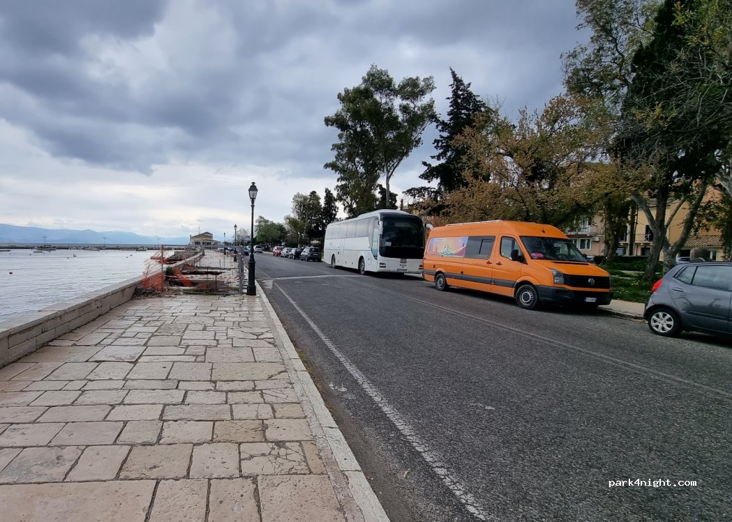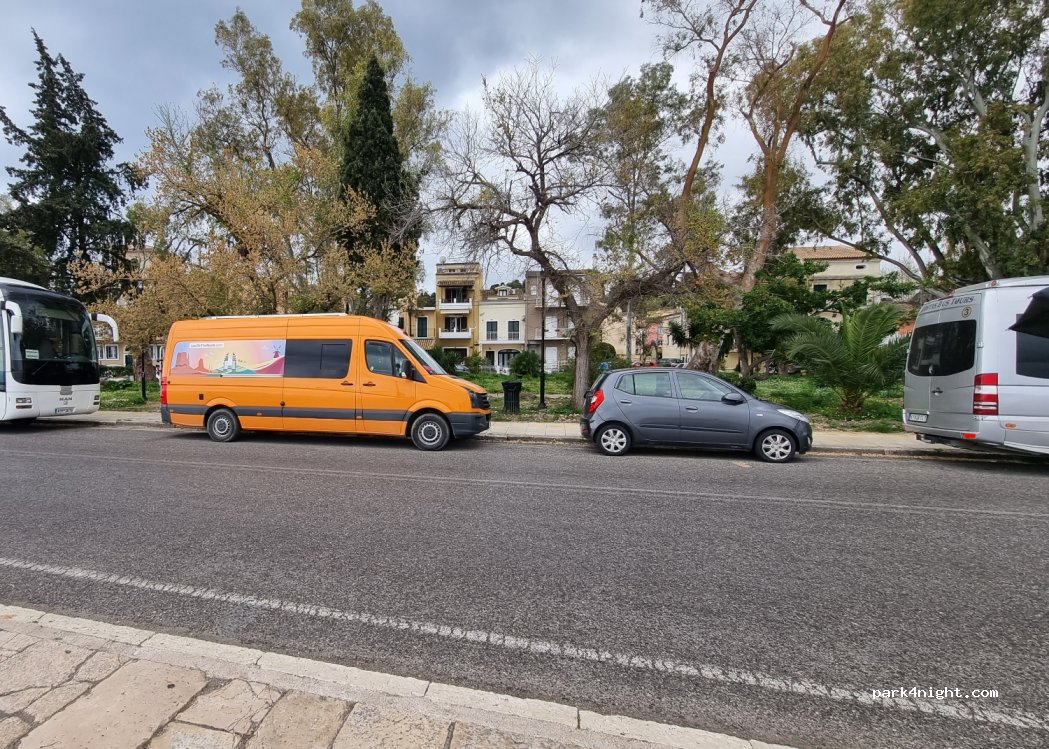 Free Parking on the left side of the road. A local friend from Corfu suggested us this parking used by locals. Here park also buses, vans and local cars. Great view of Corfu bay, 30min walk to reach the center. Felt very safe (many cars/bars/people around). Not the quietest place (it's ON the main street), but the position is good for visiting corfu town day or night.