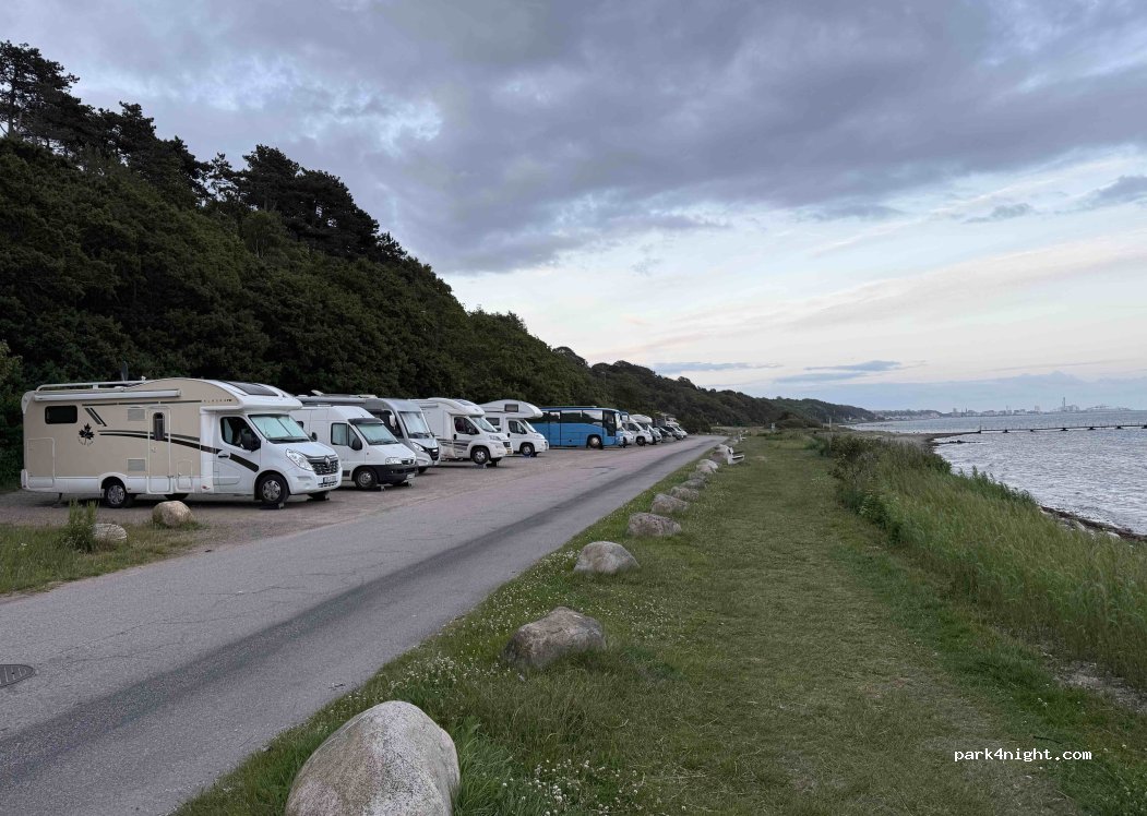 Superb location facing the sea and coast of Denmark. Actually 2 areas : one with long places ideal for vehicles >6m and a second at the beach for smaller <6m on land side + a car row on sea side. However way too much campers parked on car places, locals seemed annoyed and I would not be surprised if this place is shut down for campers in the future. There are toilets in area1 and swimming in area2